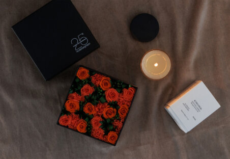 The flower box inspired by this fragrance features vibrant orange roses and carnations, accented with eucalyptus and pieris greens. Its radiant, sun-dappled palette adds warmth and brightness to daily life.