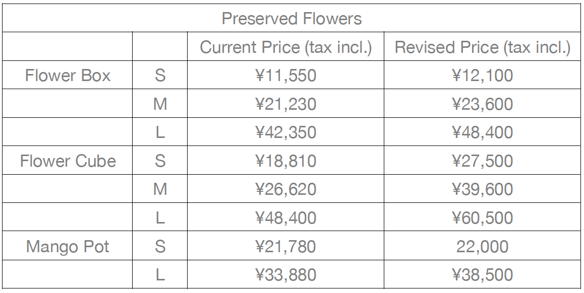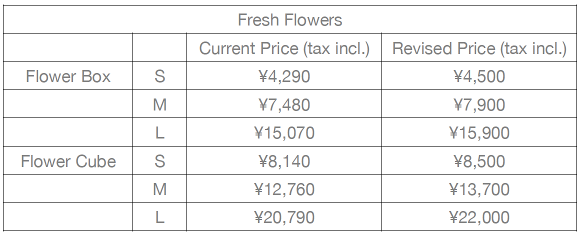 However, due to the recent global increases in energy costs, rising material prices, growing labor costs, and the ongoing increase in the price of fresh flowers—the main cost of our products—maintaining our current price has become extremely difficult. Therefore, it is with a heavy heart that we must inform you of a price revision for certain products which are listed below.