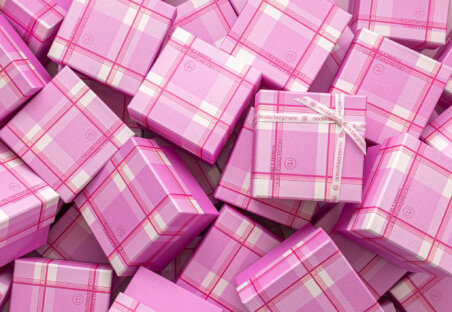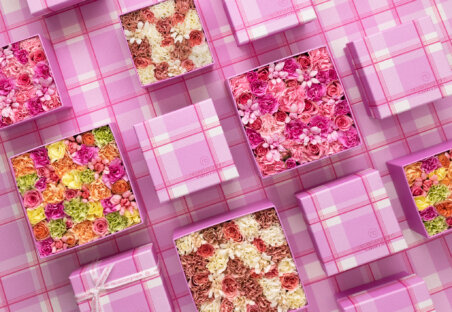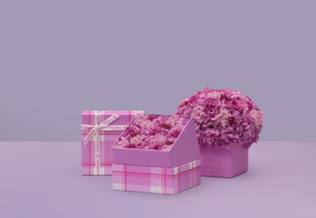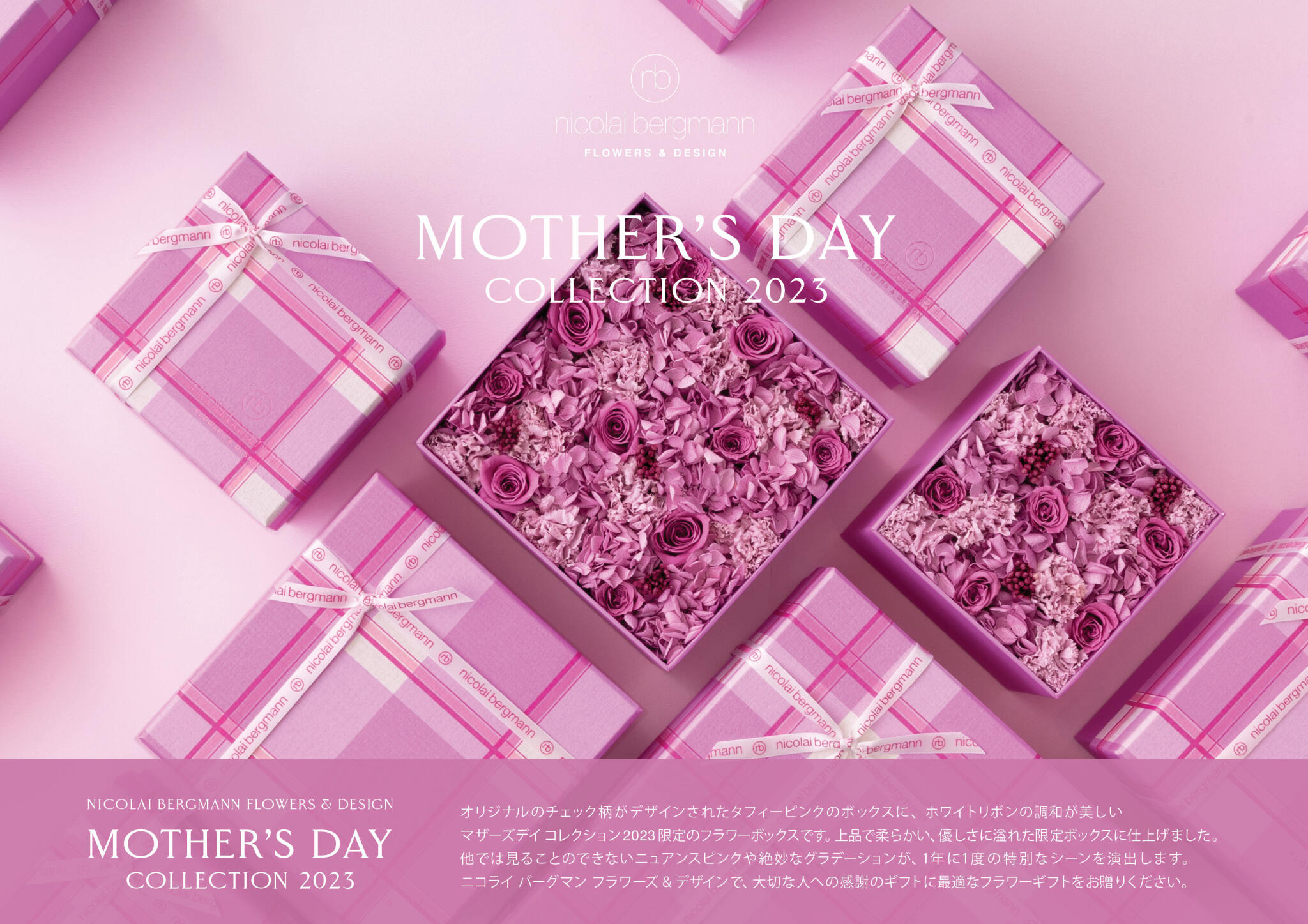 オリジナルのチェック柄がデザインされたタフィーピンクのボックスに、ホワイトリボンの調和が美しい、2023年限定のマザーズデイ コレクション。