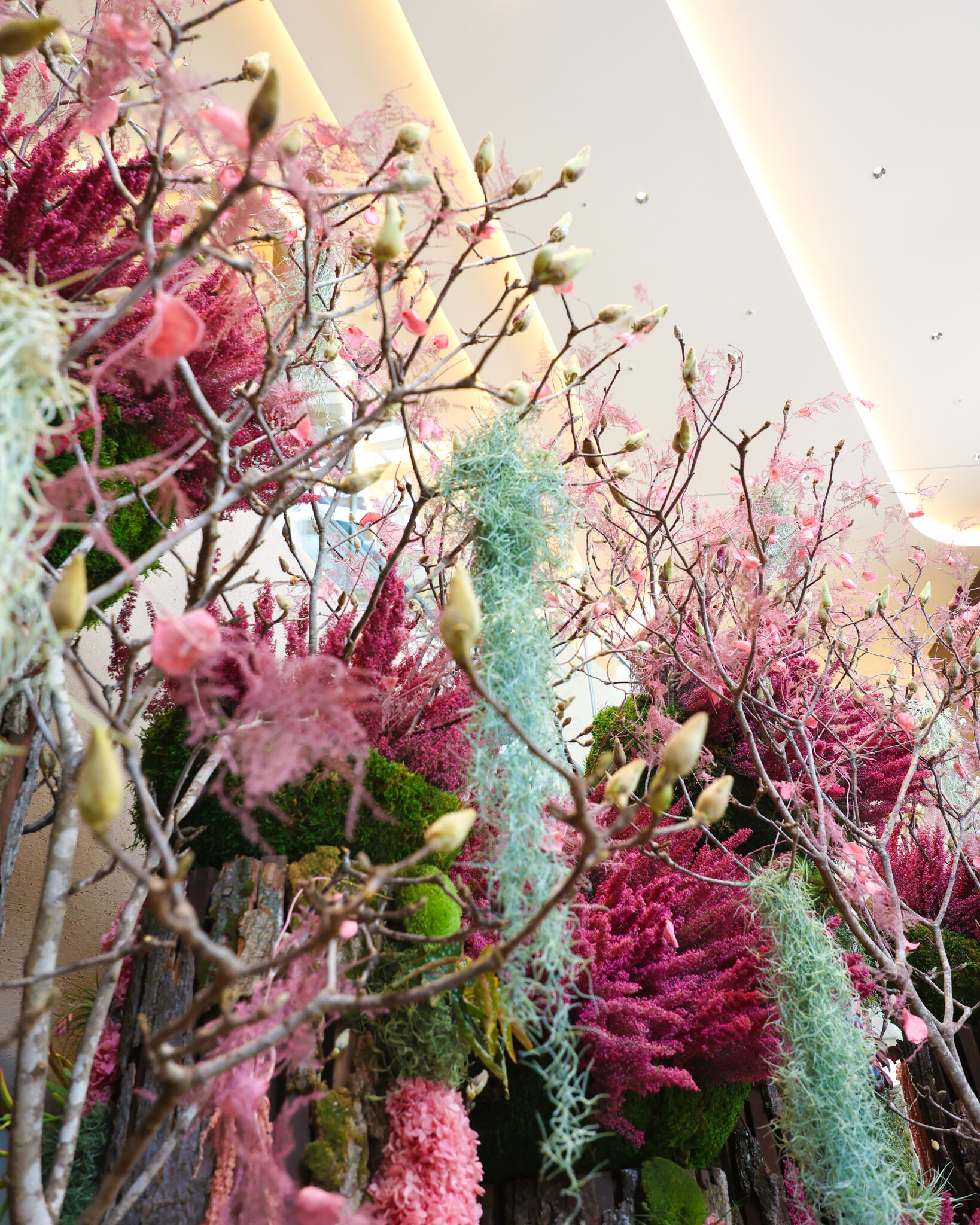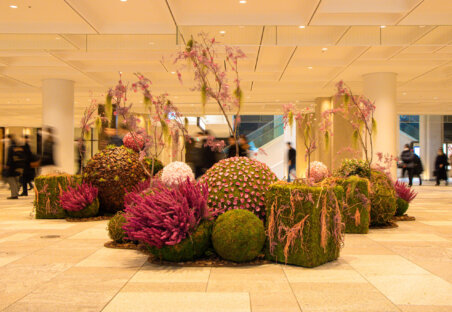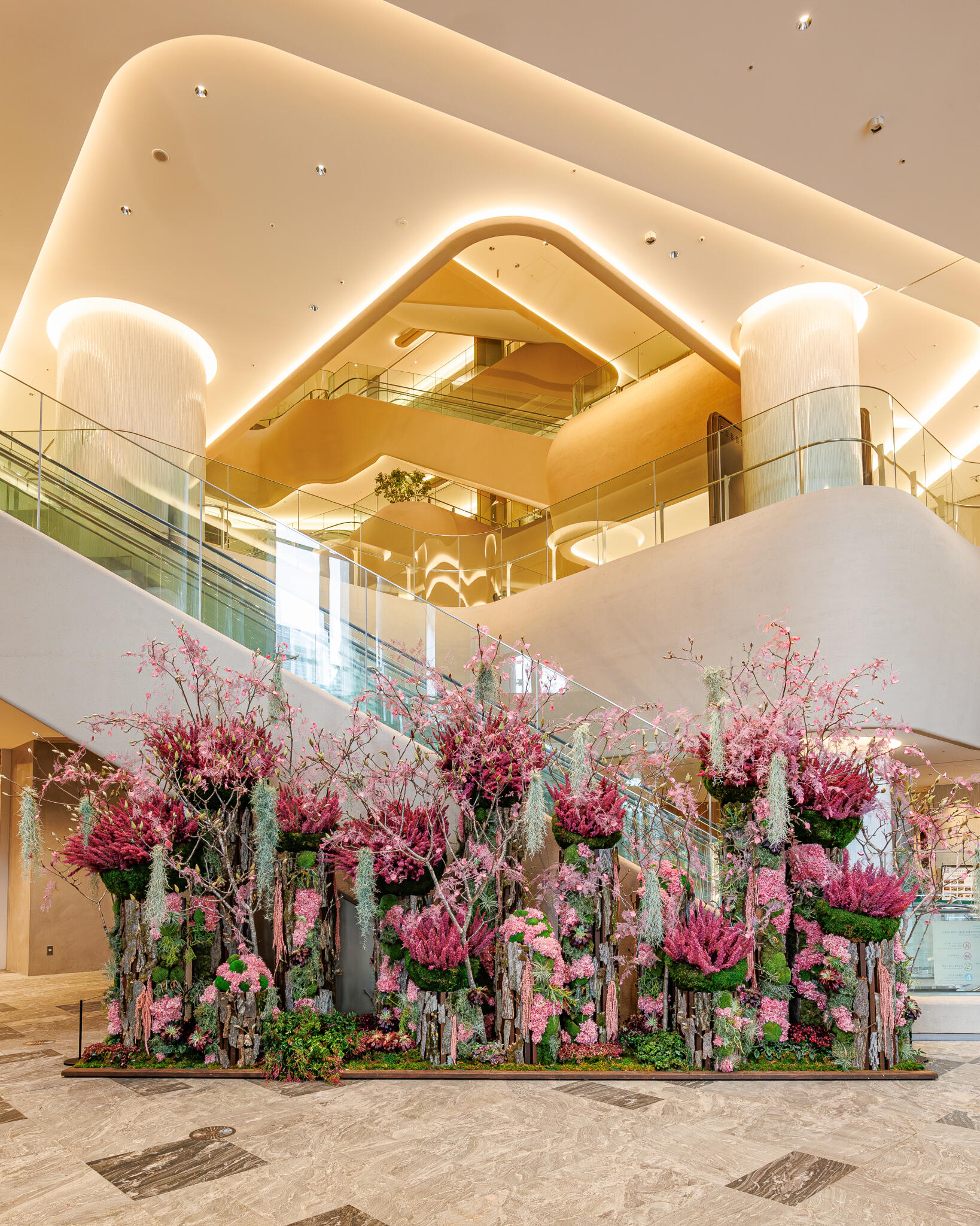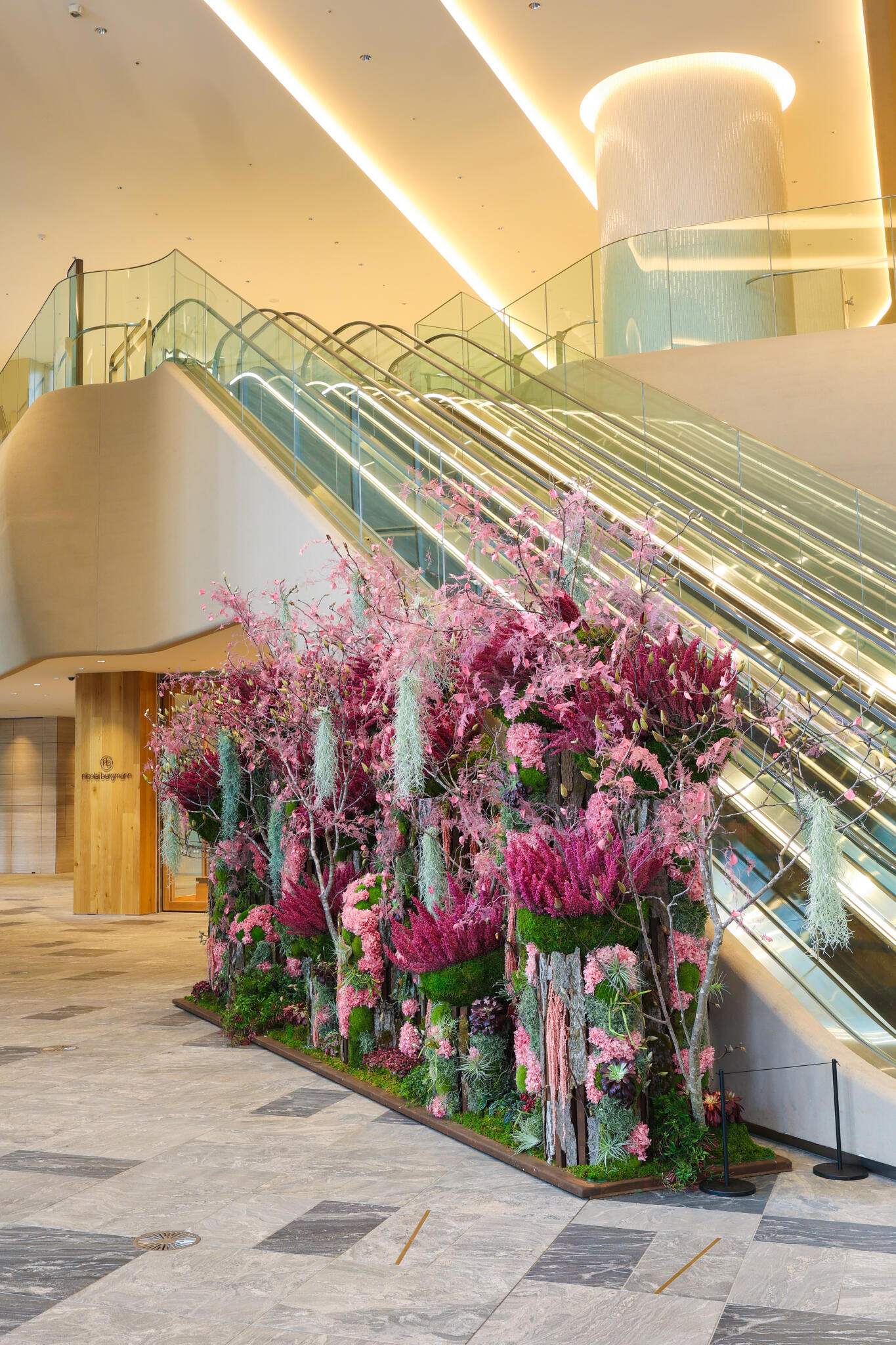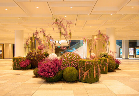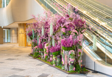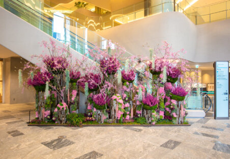 ニコライ バーグマン フラワーズ & デザイン麻布台店と同フロアのタワープラザB1エスカレーター前では、満開の桜を想起させるプリザーブドフラワーウォールを展開しております。複数種の自然の枝を組み合わせて力強い桜の幹を表現し、その先には鉢物やエアープランツをベースに、ピンク色のプリザーブドフラワーで咲き誇る桜を表現。圧倒的なスケール感と華やかさで、訪れる人の記憶に残るフォトスポットとしてもお楽しみいただけます。