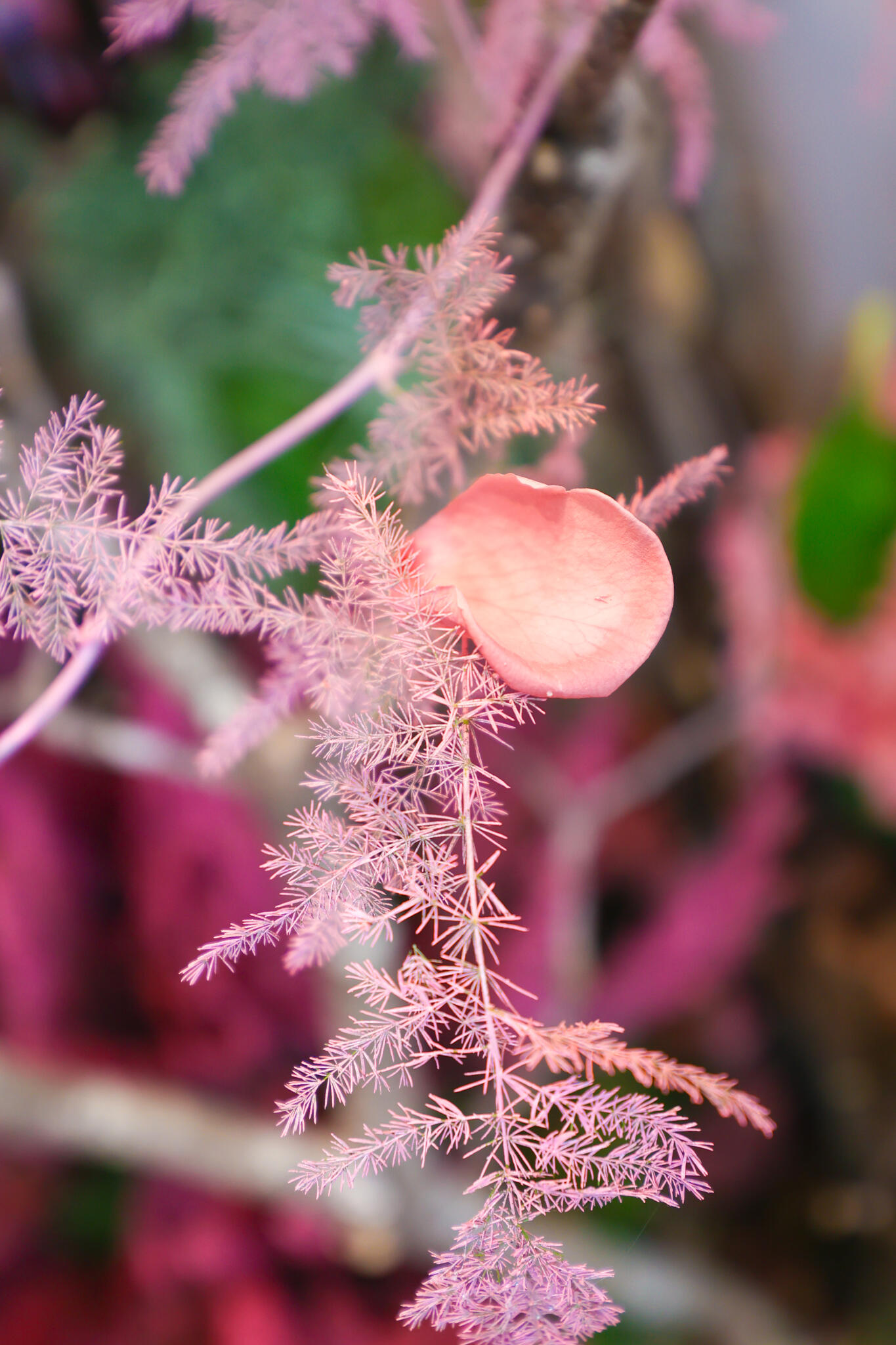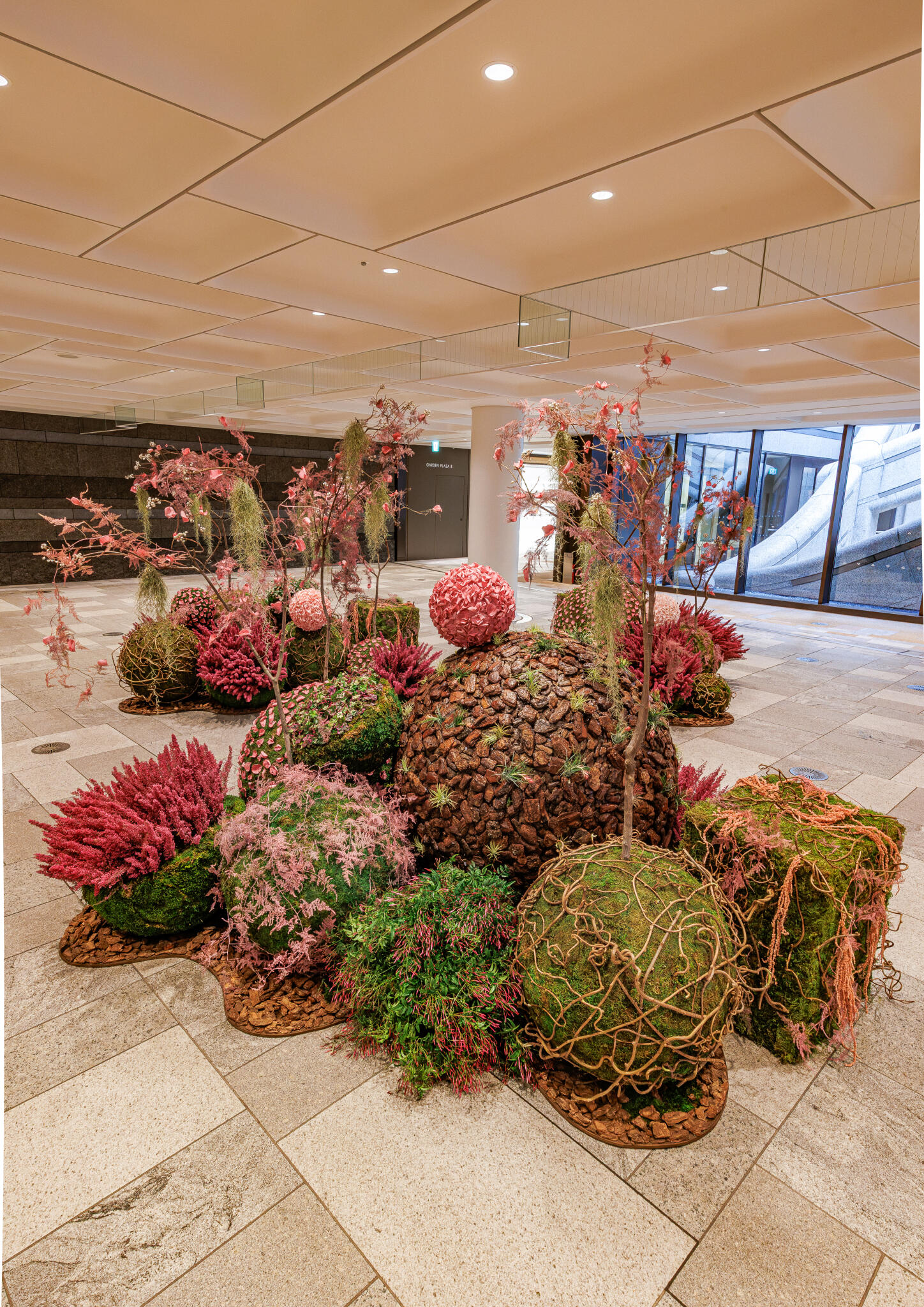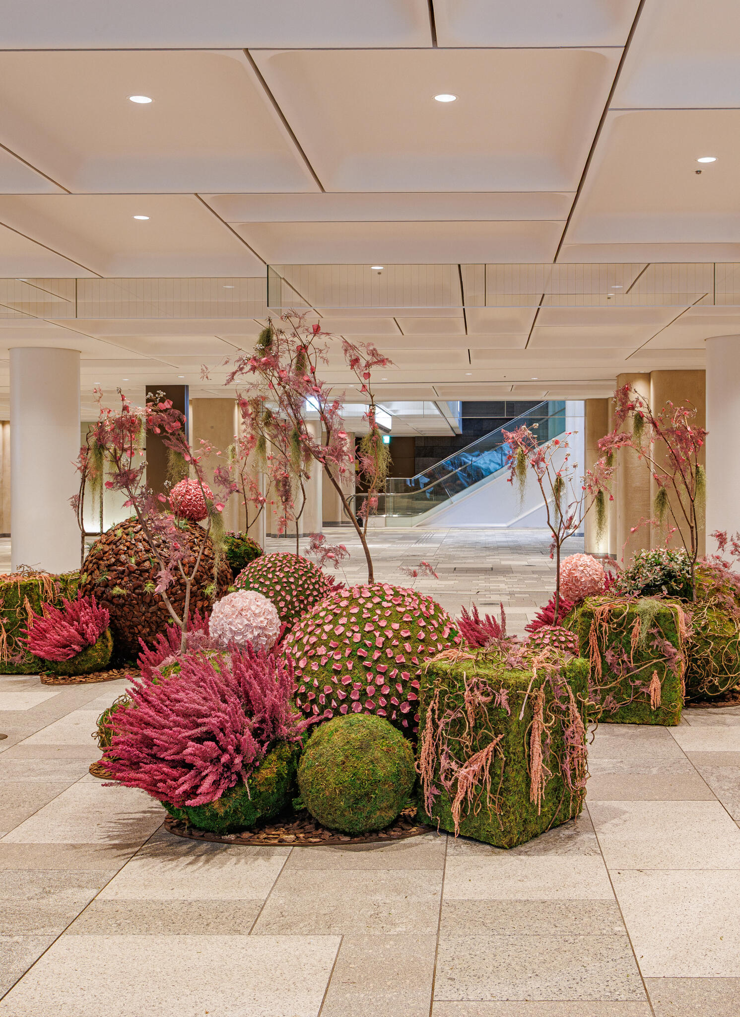 ニコライ バーグマン フラワーズ & デザイン麻布台店と同フロアのタワープラザB1エスカレーター前では、満開の桜を想起させるプリザーブドフラワーウォールを展開しております。複数種の自然の枝を組み合わせて力強い桜の幹を表現し、その先には鉢物やエアープランツをベースに、ピンク色のプリザーブドフラワーで咲き誇る桜を表現。圧倒的なスケール感と華やかさで、訪れる人の記憶に残るフォトスポットとしてもお楽しみいただけます。