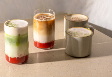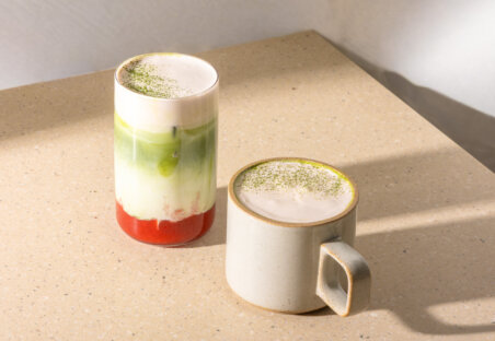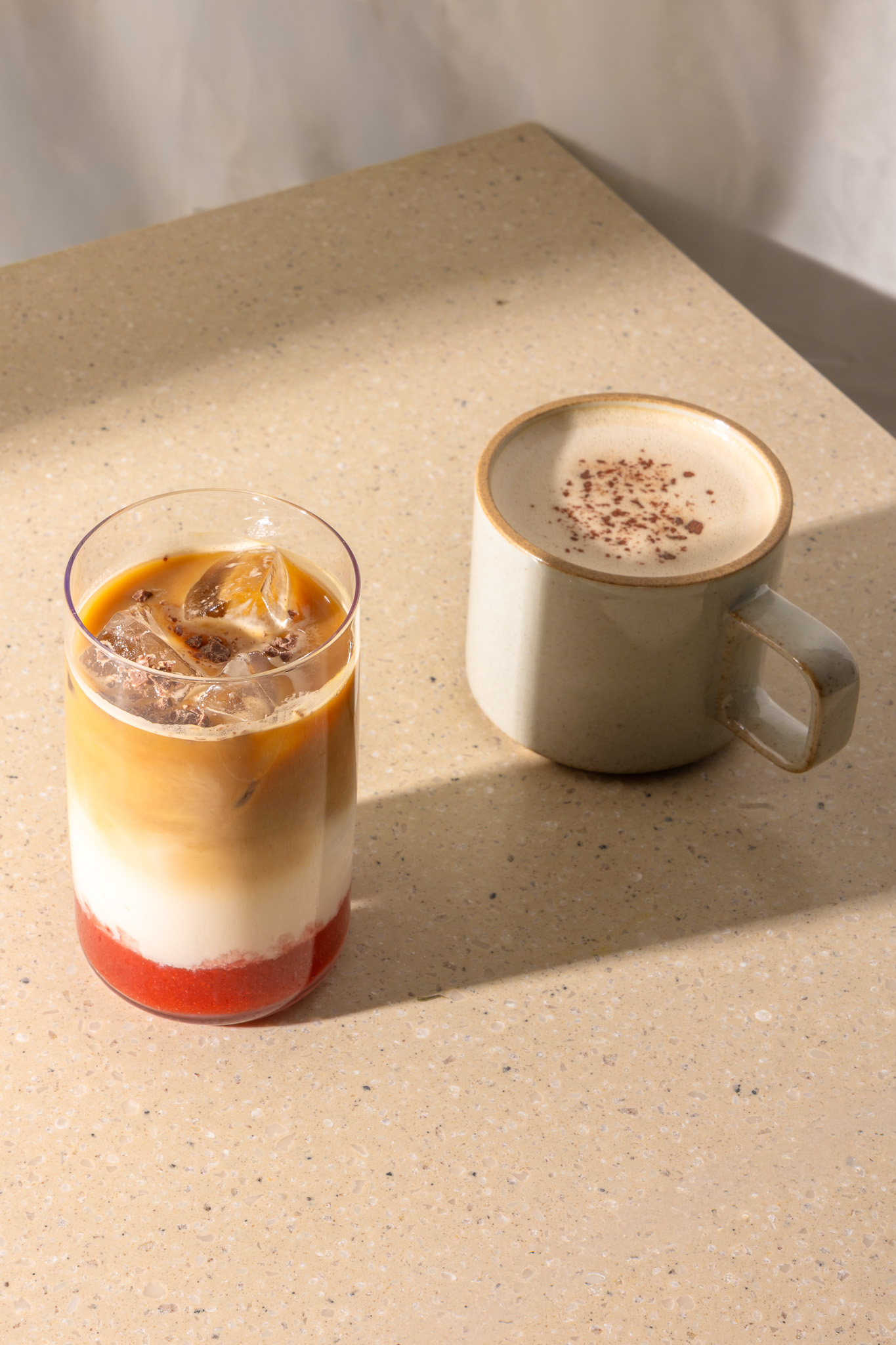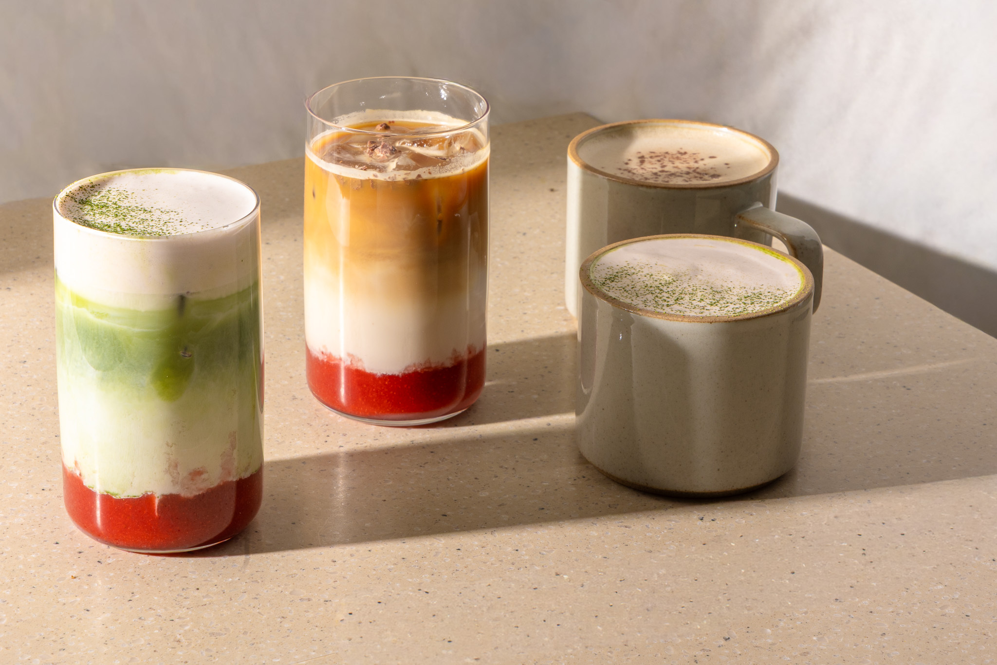 上質な抹茶の豊かな香りと、濃厚なストロベリーピューレ、仕上げにふんわりストロベリークリームを合わせた、華やかな4層仕立てのラテ。飲み進めるごとに抹茶といちごのバランスが変化し、抹茶のほろ苦さと、いちごのフルーティーな酸味が溶け合って、奥行きのある贅沢な味わいに仕上げました。今だけの春を感じる一品です。