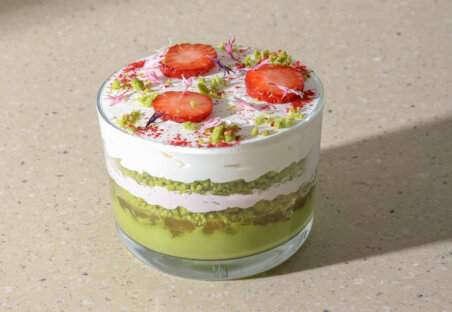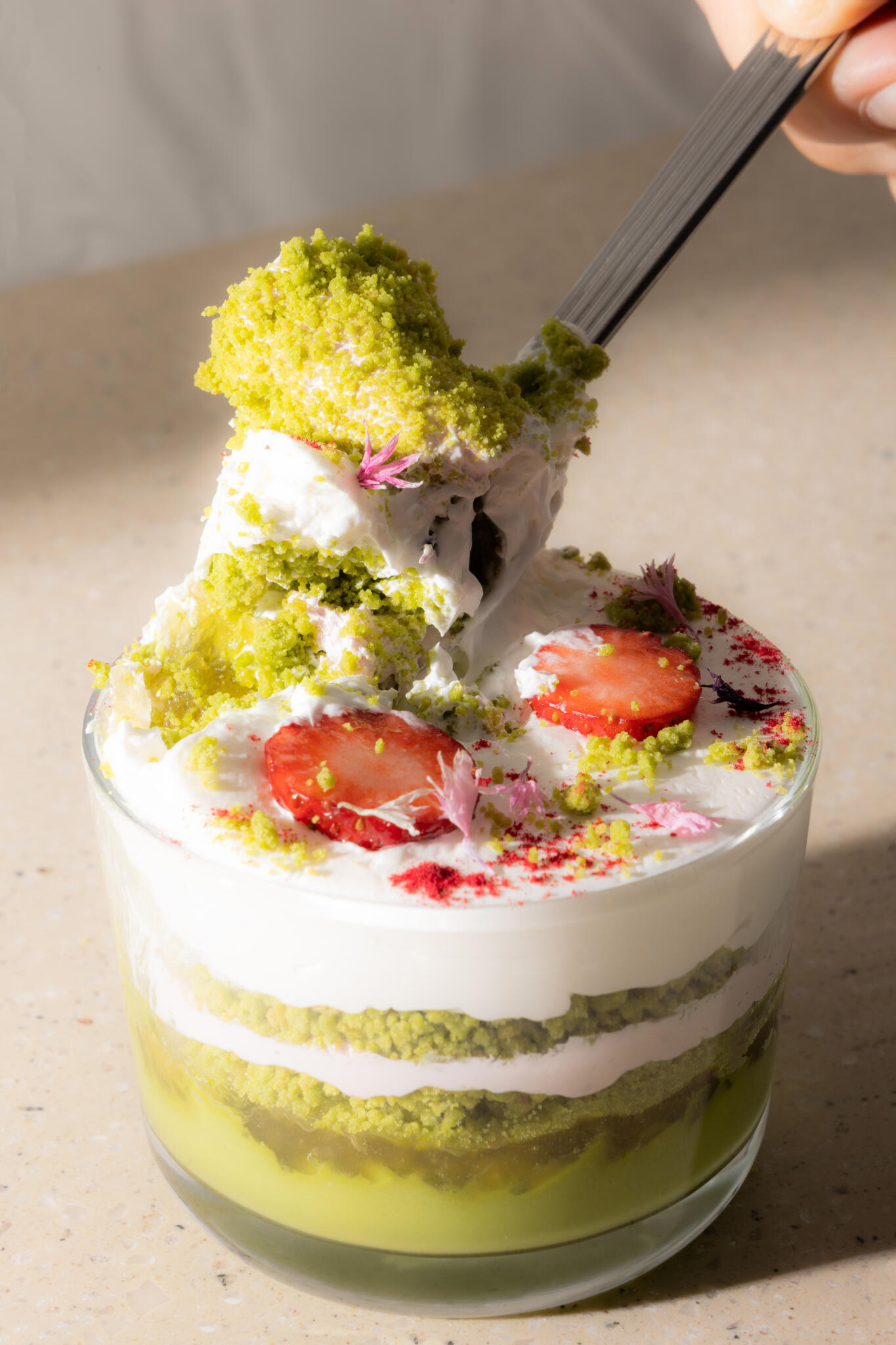 奥深い抹茶ムースに、りんごのみずみずしい甘みと抹茶クランブルの食感を重ねた春らしいトライフル。桜ホイップとマスカルポーネホイップが全体をやさしく包み込んだ、春の訪れを感じさせる一品です。